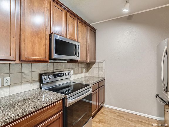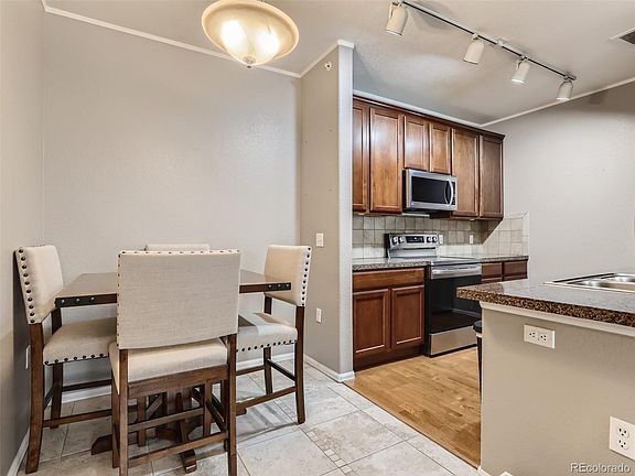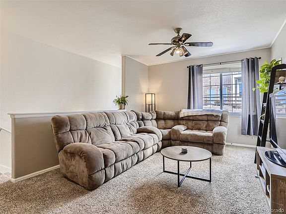 This upper level condo has an open feel and nice finishes. Kitchen features 42" cabinets with crown molding, tile backsplash, granite tile counters, and newer stainless appliances including a convection oven with air fryer. There is an adjacent eating nook and breakfast bar that are open to the living room and high ceilings. The washer dryer are newer stack units. The balcony is accessed from the living room and in a quiet location away from the parking lot overlooking a grass area. There are ceiling fans in the living room and both bedrooms to provide air movement. There is a walkin closet in the master bedroom in addition to a linen closet and the home has 6 panel doors throughout. The bathroom has a tile floor and a large feel. This spacious condo is move in ready and features good access to DIA and Buckley AFB. Seller is offering $3,000 allowance for carpet replacement or to use as buyer desires.