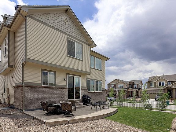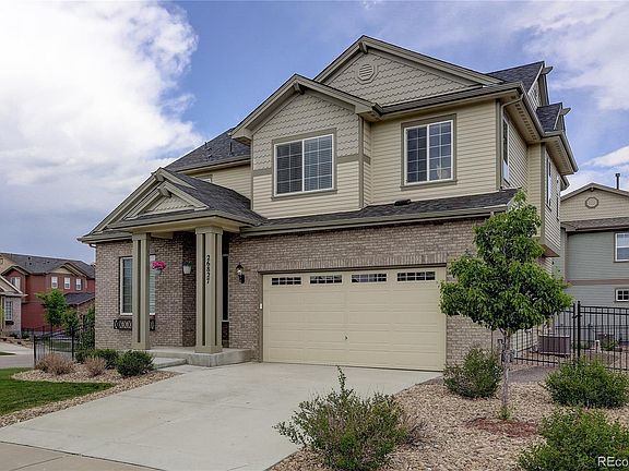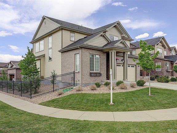 BEST VALUE in Blackstone Country Club! HOA includes social membership (access to tennis courts, pool, restaurant & gym). Served by Coveted Cherry Creek schools. This stunning 2-Story home is located on a corner lot in the Northwest corner of the neighborhood near the driving range. Only a half mile to the gorgeous Clubhouse with indoor and outdoor dining, pool, golf, fitness center, and tennis courts! As you enter from the covered front porch, gorgeous hardwood floors greet your feet and flow throughout most of the main level. Your private office is immediately on the left with french door entry, carpeted floors, and ceiling fan. Continue into the home and walk into the Great Room with grand 19' ceilings, built-ins, tons of natural light, recessed lights, and a gas fireplace with stone surround and wood mantle which flows right into the eat-in Kitchen. Gourmet kitchen features granite countertops, island w/ breakfast bar, 42" white cabinetry, glass tile backsplash, recessed & accent lighting, walk-in pantry, stainless steel appliances, and sliding glass door access to the cozy patio for outdoor dining. A powder bathroom completes the main level. The upper level holds all three bedrooms, including the Master Bedroom with 10-foot tray ceiling & en-suite 5-piece bathroom with granite countertops, tile floors, and walk-in closet. All bedrooms with carpeted floors and ceiling fans. The two auxiliary bedrooms share a 4-piece bathroom with dual sinks and granite counters. The laundry room with tile floors completes the upper level. The unfinished basement is great for storage, home gym, workshop, or finish the space and add an extra bedroom or bathroom. Basement with rough-in plumbing and 3 egress windows. The fenced backyard features a stone patio, sprinkler system, grassy area, and xeriscaping. The garage is extra deep on one side, a perfect space for a workbench or golf cart parking. Close to Southlands & E-470. Be sure to check out the clubhouse!! WELCOME HOME!