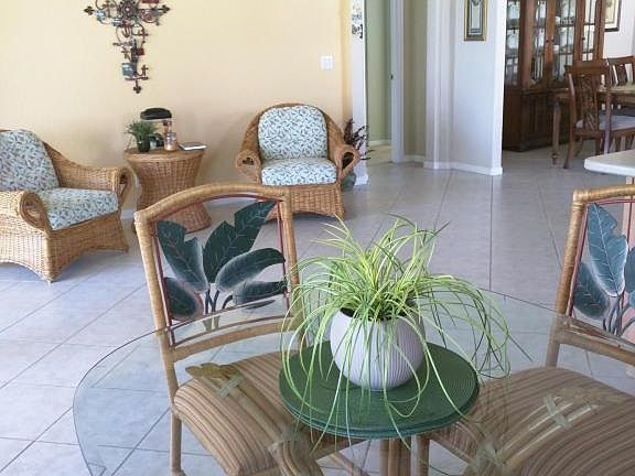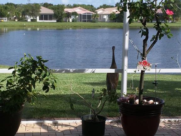 Beautiful very open waterfront home. New A/C and smudge proof stainless steel appliances. Plantation shutters and custom drapes. Dining chandelier doesn't convey Porcelain tile throughout except master bedroom & guest bedroom has carpet. Third bedroom/office has wood looking porcelain tile. Vaulted ceiling, crown molding, custom paint, 3 way sliding glass patio doors with Hunter Douglas cellular accordion window treatments open onto XL screened covered lanai overlooking lake. Master bedroom has his/her vanities, Jacuzzi tub and triple walk-in closets. Laundry room with tub and cabinets off 2 car garage with shelves. Active 55+ community with resort style clubhouse, 3 pools, tennis, bocce court, ballroom. Close to shopping, dining, entertainment, PBI Airport, City Place, beaches and mor