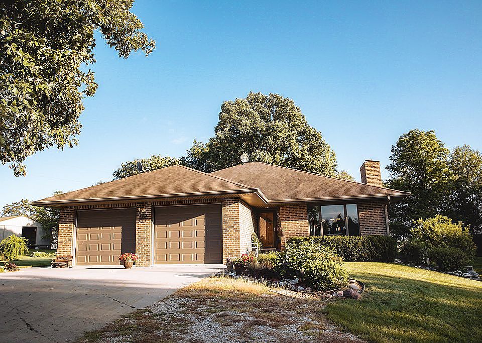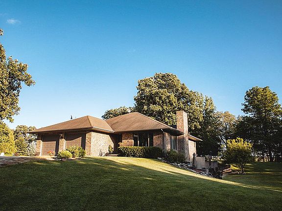 Rare opportunity to own a beautiful and private acreage! A quality constructed brick ranch home sits on 9.35 acres with mature oak and evergreen trees surrounding the property. The home boasts an open floor plan with large Anderson windows providing tons of natural light. Lovely oak hardwood floors run throughout the kitchen, dining, laundry, and master bedroom spaces. A spacious master bedroom is on the main level with a large walk-in closet and 3/4 bath. Also on the main level are a large and bright living room, full size bath, another bedroom, laundry room, and a kitchen with ample storage, including a pantry. The walk-out lower level consists of a large family room with a beautiful wood burning fireplace, a large bedroom, 3/4 ceramic tiled bath, and a recreation/game room. Enjoy your morning coffee or watch the sunsets from one of the two concrete patios. A 60’x 42’ Morton building with full concrete floor provides all the storage you will ever need. Property also includes three acres of tillable land, fenced in pasture, hay field, apple trees, and a meticulously landscaped large yard. Don’t miss out on this wonderful and peaceful property!