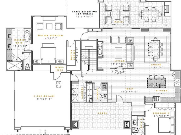 The Kaibab plan is mostly single level and keeps owners within reach of the alpine environment around them. Center-sliders in the family room open to a spacious patio with breath taking views of the surrounding Ponderosa Pines. This open three-bedroom floorplan with an additional upper-level family room offers privacy and commune in an unmatched natural setting.