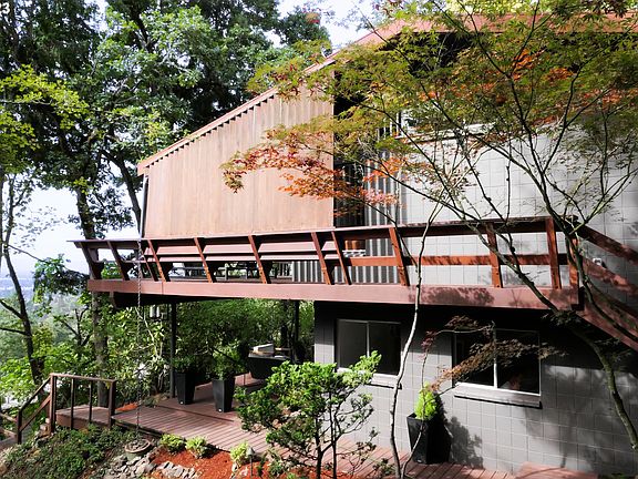 This Mid-Century Modern"Treehouse" features some of the best views in town and designer touches throughout. Only minutes from the University of Oregon and charming downtown Eugene, serenity and wildlife abound in the sought-after Fairmount Neighborhood. Life is better at the top of the hill! Perched on the lushly forested hillside, this architectural gem combines meticulously maintained period details with carefully selected, move-in ready finishes. Light oak wood floors throughout the living areas. The kitchen is brand new with high-end appliances, new cabinets, and counters.Be mesmerized by the stunning showcase of the seasons transitioning before your eyes as they flow beautifully from one to the other. The open-concept living area embodies the MCM spirit with its clean lines and wood beam ceiling. This spacious room welcomes plenty of natural light, creating a warm and inviting atmosphere. The kitchen is a delight for culinary enthusiasts. Boasting modern stainless steel appliances, ample cabinet space, and a large island, it's perfect for whipping up gourmet meals or hosting casual brunches.The two generously sized bedrooms have new carpet, electrical, and fixtures The primary bedroom features its own private covered patio with sunset views. The second huge bedroom is versatile and can be a den, home office, guest room, or flex space. Both bathrooms have been thoughtfully designed with a touch of luxury and vintage taste in mind. The home's electrical was updated last year.You will enjoy all the PNW has to offer in this architectural gem. Hendricks Park and hiking trails are at the end of the block and you'll enjoy true indoor/outdoor living from the spectacular wrap-around deck. Shopping, dining, Laurelwood Golf Course, and more are just minutes away. In this MCM home, you'll discover more than just a house, you'll find a home where memories can be created. Don't miss the opportunity to own this slice of South Eugene heaven.