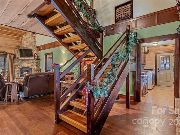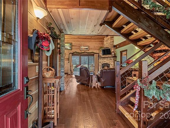 Quality construction (reinforced rebar in logs, variety of woods used inside the home, standing seam metal roof (stronger than normal), garage that opens front and back (drive through)). Hot tub, pool table and riding lawn mower. Enjoy your morning coffee on the porch as the deer graze in your backyard, peaceful, yet close to town. 7 miles from John C Campbell Folks Art School and 24 miles to William Holland Mining Retreat.
