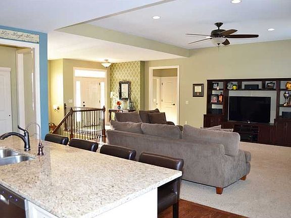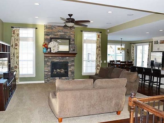 Meticulously-maintained ranch ready for new owners! Open floor plan that features a great room with floor to ceiling stone gas fireplace. Gorgeous hardwood floors throughout the foyer, kitchen, daily dining area, & drop zone. Gourmet kitchen with granite countertops, upgraded cabinets, stainless steel appliances, corner pantry, breakfast bar, & dining area with sliders to the oversized patio. Main level laundry room & drop zone with lockers. Split bedroom design with spa-like master suite with walk-in closet, huge walk-in tile shower, tile floors, tub with tile surround, dual vanities & linen tower. 2 additional bedrooms & bathroom with tile floors completes the main. Lower level rec room with daylight windows & wood burning stove, 4th bed, bath & lots of storage space. Fenced-in yard & custom-built columns on front porch. Security system & wired for sound. Desirable location near walking trail, community pool, & schools!