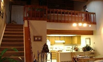 This Denver two-story townhome offers a wood-burning fireplace, loft, vaulted living room ceiling, kitchen granite countertops and stainless steel appliances, and a one-car garage.