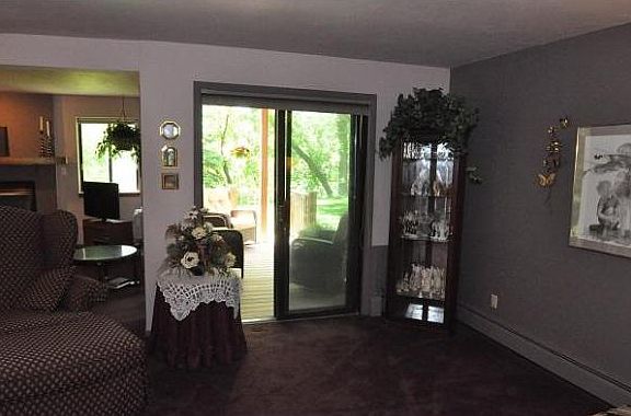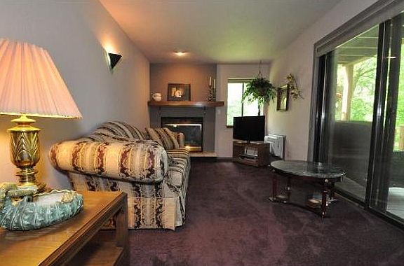 Move right in! Upgrades galore! Unique layout offers several ways to set up your home. Two patio doors to deck and overlooking private area. Updated kitchen with snack bar, newer appliances and tile floor. Space master bedroom, with walk-in closet. Full bath with soaking tub and tile - all updated! Condo fees include heat and water costs. This unit offers its own garage space!