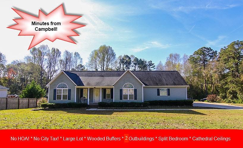 Come Home to this Charming 3BD/2BA Ranch Nestled on Large .86 Acre Lot*Only Min. From Campbell University & a Short Drive to Raleigh & Fayetteville*Rocking Chair Front Porch*Split BD Floor Plan*Spacious Living Room Boasts Ceiling Fan & Gas Log FP*Separate Dining RM*Master Suite w/ WIC, Cathedral Ceiling & Large Walk In Shower*Relax or Entertain On Your Grilling Deck Overlooking Huge, Private Back Yard w/ Wood Buffer*Oversized 2 Car Garage & 2 Outbuildings!*Not in a Subdivision, NO City Taxes*A Must See!