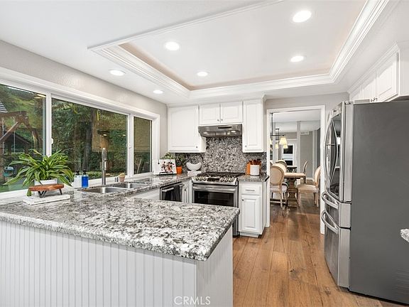 Welcome to 26876 Via Grande! As you enter your home through the double door entry, you’re instantly greeted by the high vaulted ceilings, a sweeping staircase and formal living room, adorned with a cozy fireplace and an array of windows bathes the home with natural light, highlighting the soft neutral color palette and engineered hardwood floors throughout. The heart of the home lies within the beautifully updated kitchen, boasting granite countertops, a double oven, gas range, stainless steel appliances, step-in pantry, and an eat-in breakfast nook. Adjacent to the kitchen, the family room provides a comfortable retreat with its own fireplace and seamless flow to the meticulously maintained backyard oasis. Here, you'll find the perfect setting for entertainment, complete with a, pergola, cozy firepit, ample seating areas, a large grass area, fruit trees, vegetable garden, and terraced slope. Convenience meets versatility with a main-level bedroom currently utilized as an office, while the downstairs powder bathroom is thoughtfully plumbed for a future tub and/or shower. Retreat to the primary suite, generously sized and featuring an ensuite bathroom with his and her closets, walk-in shower, and private water closet. Upstairs, two additional generously sized bedrooms, two linen closets, and a secondary bathroom with tub/shower combo await. The immaculate garage boasts epoxy-covered flooring, built-in cabinetry, and a laundry center with sink. Inquire for more information about multiple school options unique to this desirable neighborhood. Enjoy the perks of Lake Mission Viejo membership, offering swimming, BBQs, fishing, boat and paddleboard rentals, concerts, and events. Conveniently located just a short stroll away from Granada Park and Sierra Rec Center, offering various membership options to fitness centers, pools, spas, waterslides, and more. Easy access to the 5 freeway, shopping, restaurants, and only a 10–15-minute drive to world-class beaches, 5-star resorts, Laguna Beach, Dana Point Harbor, and the Lantern District. This home epitomizes the best of Orange County living. Welcome home!