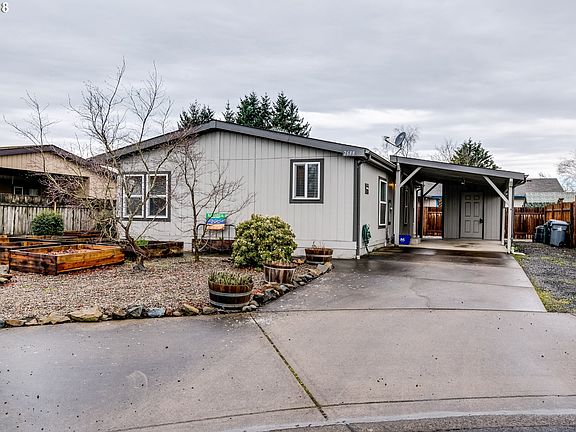 Nice Redman manufactured home featuring vaulted ceilings, HVAC, beautiful laminate flooring, and plenty of natural light throughout. Has a lovely manicured low-maintainence front yard, covered entry, storage shed, and plenty of raised beds for the enthusiastic gardener. Home is on a land-lease for $525/month. It is nicely situated at the end of a culde-sac to allow for some privacy.