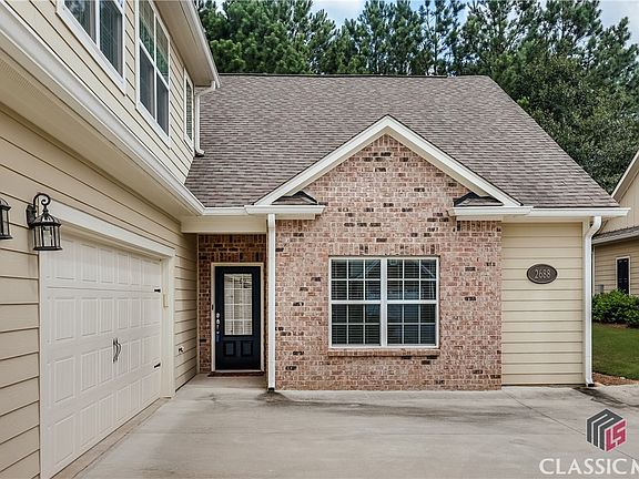 Enjoy life to the fullest and find a maintenance-free and serene lifestyle at the Cottages at Creekside. This lovely home will capture your heart with its welcoming community, its comfortable, smart layout and its elegant features. Built in 2016, this unit is perfectly clean and in immaculate, pristine condition. The interior is flawlessly maintained, and the community association responsibly cares for the exterior, the grounds and the common areas. This condo features one-level living with an open layout and spacious, handicap accessible rooms. The living area is spacious and adjoins a dedicated dining space, a generously sized kitchen and a cozy breakfast nook or keeping room. You'll love the covered back patio, accessible through French doors from the great room with views of a beautiful grassy space and a natural wooded area behind the unit. The back patio offers a peaceful and private escape to sit and enjoy being outdoors. The kitchen is a dream with its long island with counter-height seating, gorgeous granite countertops, under-cabinet lighting and ample cabinets and storage. The kitchen is complete with a large walk-in pantry, stainless appliances and a gas stove. A powder room and laundry room are located down a wide hallway that leads to the garage entry. Just passed the door to access the two-car garage is a large storage room with tiled flooring - the perfect space to create a handy mudroom or drop space or to use as easily-accessed, temperature controlled storage. Two bedrooms share a full hall bathroom, and the owner’s suite is tucked down a small hallway. The owner’s suite offers a large bedroom with stylish tray ceilings and a luxurious bathroom that includes a spacious roll-in tiled shower, a double vanity, a soaking tub, a water closet, and a huge walk-in closet. A wide carpeted staircase leads to a second floor - ready to be finished for an added bonus space or providing for additional storage as it is now. It's already framed and stubbed, so you could easily finish the space for a huge bonus room, another full bathroom, and two large walk-in closets —ideal for guest quarters or a fun hangout spot. 2688 Orchard Circle is a rare gem in a well-kept community. You'll have access to a clubhouse, two pools, tennis courts and a fitness center within an active community, and this home is located just minutes to destinations in Athens or Oconee County for shopping, restaurants and entertainment.