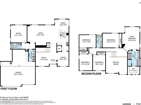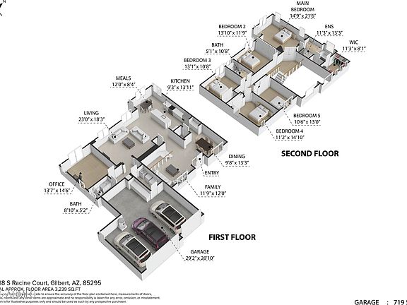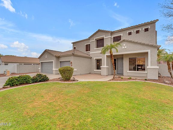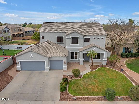 This rare cul-de-sac home sits on over a quarter of an acre and offers a spacious and well-designed floor plan with five bedrooms and three full bathrooms. The home features formal living and dining rooms, along with a den, all accented with decorator touches throughout. The open-concept family room flows seamlessly into the kitchen, which is equipped with 42-inch hickory cabinets, a walk-in pantry, a butler's pantry, and a breakfast bar. One full bedroom and bathroom are conveniently located downstairs, perfect for guests or a home office. The backyard is designed for both relaxation and entertainment, featuring a fenced play pool, an extended covered patio with a built-in fire pit, and plenty of space to play or create an outdoor retreat. The three-plus car garage includes a workshop with a built-in workbench and shelving, with a side door leading to a fenced side yard and an RV gate. This home has been freshly painted outside, and partially inside, giving it a bright and updated look. Conveniently located near the hospital, SanTan Village Mall, and with easy access to the SanTan 202 Freeway, and plenty of shopping and restaurants. The home offers both privacy and accessibility.