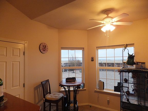 Spacious, custom home, open floor plan,325 sq ft BONUS Rm above 3 car garage w/work bench/station - 2225+ total Sq Ft of living space, quiet area, unobstructed view of mountains from kitchen/bedrooms on 9.98 acres. ASSUMABLE VA loan or Lease to Own!!!Kitchen: Stainless steel appliances, 20 bottle built-in wine rack, large pantry, handcrafted Cherry wood custom height cabinets, breakfast bar and nook,; Formal dining room; LRG Master Bdrm w/sitting area, ensuite w/2 vanities, separate soaking tub/shower, and 2 walk-in closets. Tile in living areas w/carpeted bedrooms. Landscaping includes dripline to pear tree, rose/lilac bushes etc w/privacy fence; flowering xeriscaping and custom rock work in front. Partially covered patio w/BBQ, Hottub hookup. Lrg shed for 4wheeler and snowmobile. All within 10 minutes to city parks, golf course, pool and recreation center. Bring your horse/animals. Bird lovers backyard.