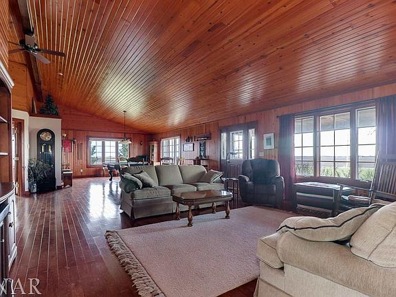 Located on 6+ pristine acres this lodge-style open floor plan home is built to last!!! Stunning tongue & groove wood cathedral ceilings flow throughout the main level. Rich tone cherry cabinets enhance the kitchen area. Extra wide doorways accommodate handicap accessibility needs. SQUARE FOOTAGE IS AVAILABLE ON THE 1st FLOOR TO BUILD OUT A 2nd BEDROOM IF DESIRED. The lower level features 2 spacious bedrooms with walk-in closets and flex space, bath and storage galore. The shiplap walls add to the lodge rustic feel. Relax on the 12 x 20 ft. front porch or back patio with koi pond surrounded by perennials. Instant water heater, 3 ft overhang, Heating-cooling system is extra efficient with a heat pump with forced air furnace. Quality built with impact resistant fiber cement siding. Machine shed is 60 x 40 which includes 20 x 40 heated workshop and 1/2 bath. Welcome to your forever home!!