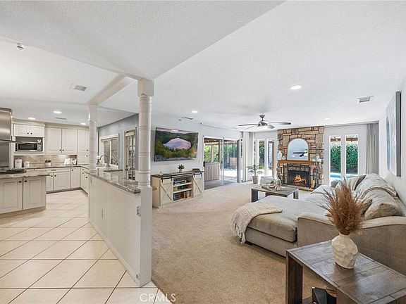This charming turnkey home offers the perfect blend of modern convenience and timeless comfort. Featuring 2 spacious bedrooms, each with its own private en suite bath, this home is ideal for those seeking privacy. Step into the living area, where a cozy stone fireplace and recessed lighting set the mood, complemented by custom ceiling fans and light fixtures throughout. The lush carpet adds warmth, while the custom interior paint adds a designer’s touch. An office addition is just off dining area. The kitchen is a chef’s dream, boasting granite countertops, stainless steel appliances, quiet-close cabinets, and a sleek stainless steel hood. A French door leads to the outdoor space, inviting plenty of natural light from the numerous windows. The home is also wired for surround sound, perfect for entertainment. Outside, the extended driveway offers RV parking potential, and the backyard is a true oasis complete with lush palm trees in front/back yard as well. Take a dip in the sparkling pool, relax in the above-ground heated spa under the covered patio (which has potential for a third room addition), and enjoy the tranquility of your private retreat. Updates include a A/C heating system in (2007) and a recently installed in 2021 roof with a 20-year warranty, ensuring peace of mind for years to come. Additionally, the owned security system and solar panels make this home as efficient as it is secure. Located close to shopping, dining, great schools, San Jacinto College, and with easy freeway access, this home is perfectly situated for convenience. Don't miss this rare opportunity to own a beautifully upgraded home in an ideal location!***Home is NOT part of 55+ community***