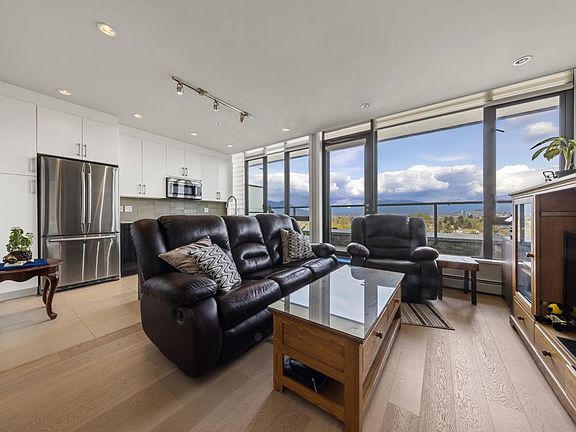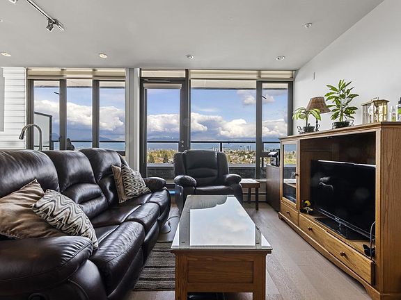 Stunning PENTHOUSE w/ breathtaking VIEWS! Welcome to Skyway Tower, a concrete mid-rise in the heart of Collingwood. Rarely available, only 4 units on the PH level, this 617 sq ft 1 bed+den is an entertainer's dream. Located on the QUIET, north side of the building. Features include eng hardwood floors, air conditioning, high ceilings, s/s appliances, floor to ceiling windows + a HUGE patio w/ unobstructed, panoramic views of the north shore, downtown, + Burnaby mountain. Rest easy in this concrete building, still under warranty. BONUS: 1 HUGE parking + 1 locker included. Pets/rentals allowed. Fantastic location close to downtown, Metrotown, cafes, restaurants, Norquay Park + a short walk to 29th Ave Skytrain. A rare offering.