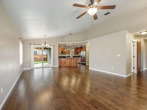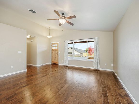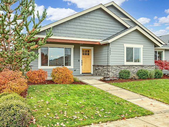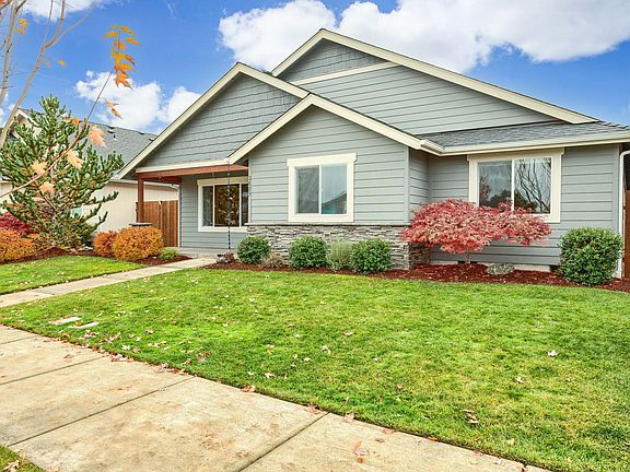 This lovely Pacific Northwest Home is move-in ready! Featuring a spacious open floor plan with vaulted ceiling and beautiful laminate floors. The kitchen offers granite counters, custom cabinets, stainless steel appliances and a nice size walk-in pantry with shelving. The laundry/mud room includes a washer & dryer with cabinets and counter area. The split floor plan offers privacy between the 3 bedrooms and 2 baths. The primary bedroom ensuite is spacious with vaulted ceiling and walk-in closet with shelving, and the primary bath offers dual sinks, walk-in shower, and an enclosed toilet room. The covered concrete patio and fenced backyard are the perfect space for enjoying the outdoors year round. The 2-car finished garage is accessed from the alley behind the home. District 7 Schools and close to Asante hospital/medical, shopping, restaurants, parks & YMCA! This home is a beauty!
