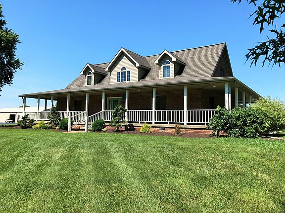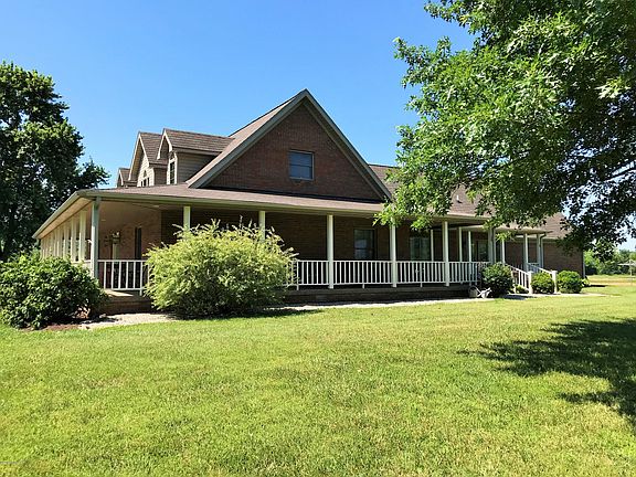 The views are breathtaking at this spectacular home situated on approx. 40 acres surrounded by beautiful wooded Ky hillsides, open crop land and the mighty Ohio River. Enjoy the serenity and beauty of your surroundings from the more than 1500 sqft. of wrap around porches w/ exposed aggregate stone floors. This wonderful brick home boasts a two story front foyer, a stunning great room with log accent wall and cozy wood stove, a spectacular kitchen with lots of lovely wood cabinets, granite countertops, SS steel built-in appliances, center island w/ cooktop and a spacious pantry. This home also has six (yes six) bedrooms & 3 full baths including a spacious master suite w/ walkout to the covered porch. This property also offers a 36' X 100' building which has another parking garage, a huge work shop complete with a vehicle lift, its own half bath and kitchen/sitting area great for taking a break during a hard days work in the shop. There is a 38' X 66' metal barn providing tons of additional storage space with an attached shed great for parking farm equipment. You will also find your own park like setting down by the river complete with your own picnic shelter, dock & boat ramp. This is sure to be a favorite spot of family & friends. This is a one of a kind property!! Don't miss this opportunity!! Call today for your private showing!!