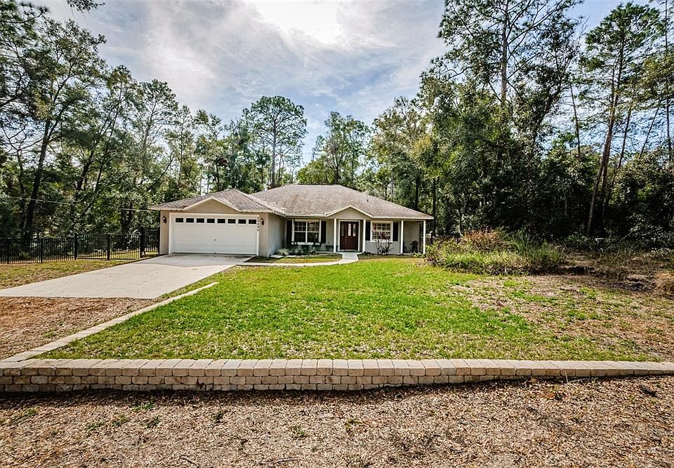 Escape to your own private sanctuary with this custom-built 3-bedroom, 2-bathroom home, perfectly situated on 1.3 peaceful acres in beautiful Brooksville, Florida. Custom built in 2006 and meticulously maintained, this home seamlessly blends modern comfort with rustic charm, offering a serene retreat surrounded by nature. From the moment you arrive you'll notice a tropical fish pond and an extended front porch with dual swings set the stage for relaxation. Step inside to an open-concept layout, where vaulted ceilings and stylish wood-look laminate flooring create a bright and inviting atmosphere. The chef’s kitchen is designed for both function and style, featuring solid wood cabinetry, tons of storage, and newer stainless steel appliances. The split-bedroom floor plan ensures privacy, with two guest rooms and a shared bathroom with a soaking tub on one side, and access to the backyard, while the owner’s suite is tucked away on the other side. The primary suite is a true retreat, offering direct backyard access, his-and-hers walk-in closets with custom built-ins, and a spa-like en suite bathroom complete with a dual vanity, large soaking tub, and separate shower. Natural light abounds through the rear slider opening to an expansive, fully fenced backyard, where peace and nature take center stage. Unique features include an 84-foot deep rock well, providing crystal-clear, filtration-free water, a 240-volt hot tub for ultimate relaxation while stargazing, and a custom-built chicken coop with five hens, offering fresh eggs daily. With no rear neighbors, thanks to a fellow neighbor for buying it to preserve it from development, you’ll enjoy uninterrupted views and frequent wildlife sightings. Additional upgrades include a new field drain and well pump, a new 200-amp power panel & an EcoFlo Smart Home Panel 2 (solar-ready), and the freedom of no HOA or deed restrictions and not in flood zone. Located just minutes from the 157,000-acre Withlacoochee State Forest, this home is perfect for outdoor enthusiasts, including the Croom Motorcycle Area, Good Neighbor Bike Trail, horseback riding trails, hiking, and camping. Offering a rare blend of modern convenience, sustainable living, and serene surroundings, this one-of-a-kind property is ready to be yours. Schedule your private tour today!