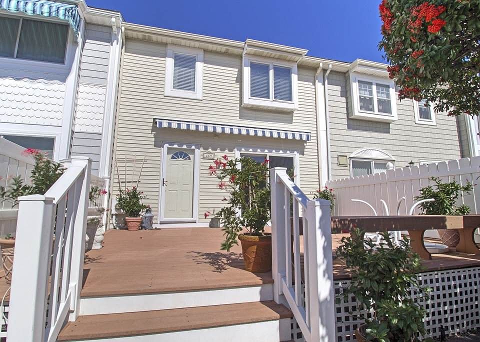 FEE SIMPLE TOWNHOME WITH NO CONDO FEES! Beautiful two-story townhome located 1.5 blocks to the beach with easy access to the ballfields, tennis courts, pickle ball courts, basketball courts, rec center, restaurants and entertainment. The traditional floorplan opens to a very large, southern exposed, maintenance free, sun deck as well as a fabulous paver rear yard. First floor offers an open floor plan allowing a large living area with easy access to the spacious patio, dining area with custom built-ins and beverage fridge and kitchen with granite tops, counter bar and a comfortable flow to the main sun deck. There is a powder room to service the first floor. Second floor has two bedrooms, hall bath and a master suite with private bath. Special features include an electric awing for the southern exposed deck, off street parking, private outside shower, full laundry closet, beautiful landscaping and attic storage. The home is sold tastefully furnished with minor decorating exceptions.