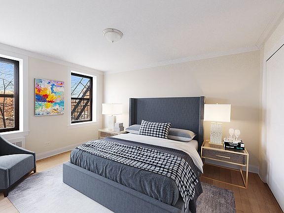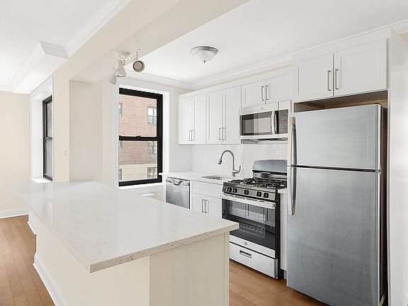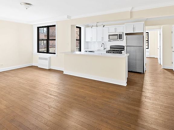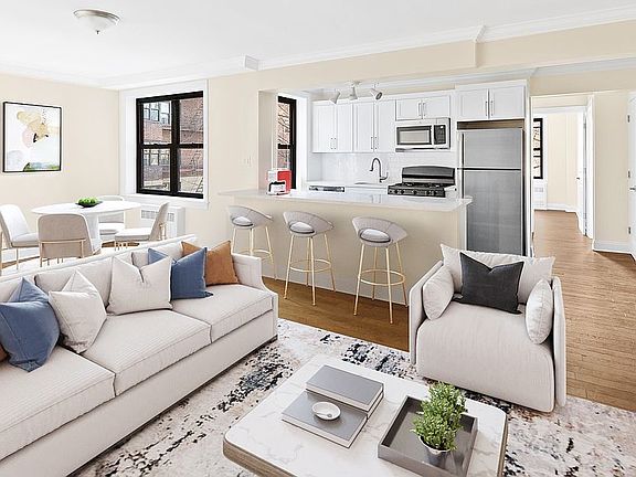Newly renovated spacious 2 BR/1BTH sponsor unit with a gorgeous open kitchen featuring custom white cabinetry, stone countertops with a breakfast bar, and stainless steel appliances. The unit features hardwood plank flooring throughout, crown molding, and a renovated bathroom.