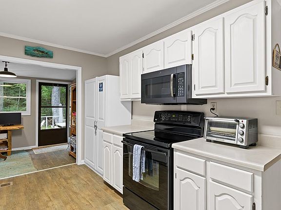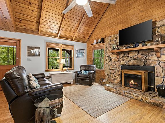 ~Cozy cabin on 1.24 acres with access to the Toccoa River~ Offers a successful short-term rental opportunity and is not in a flood zone. This delightful cabin beautifully combines vintage character with modern conveniences. Upgrades include a new HVAC system and a new mini split installed in 2023. The spacious country kitchen features plenty of cabinetry and a separate dining area that leads to a sunlit deck, ideal for entertaining. Inside the cozy living room, a vaulted wood ceiling with exposed beams and a stunning stone fireplace create a warm, inviting space. The main level master bedroom overlooks the large screened-in porch with rocking chairs, perfect for relaxing while overlooking a peaceful meadow. Upstairs, the loft-style bedroom includes a private half bath, serving as a serene retreat. The property features river access just a short walk down a gravel path to the Toccoa through a shared common area, perfect for fishing, kayaking, or enjoying nature. Outside, a spacious yard hosts a fire pit area for gatherings and a charming mountain spring that flows year-round alongside the cabin. Situated a scenic drive away from Blue Ridge and Blairsville, this home is conveniently located near dining, shopping, and outdoor activities. Best of all, the cabin comes mostly furnished and is ready for you to move right in, providing an appealing blend of comfort and adventure for your next getaway.
