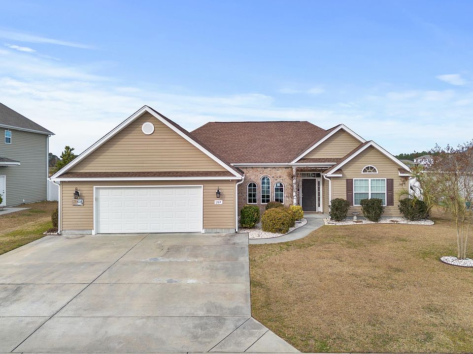 Discover timeless charm in this 3-bed 2-bath home located in the desirable Forestbrook Preserve community. When entering the home you will be greeted with a perfectly designed open-concept floor plan. From the vaulted ceilings to the engineered hardwood flooring the details in this home are exquisite. The gallery style kitchen features custom wood cabinetry, luxury granite countertops and sleek stainless steel appliances. The kitchen has plenty of room for entertaining family and guests. The split bedroom floor plan allows for a private primary bedroom suite with the two additional bedrooms on the opposite side of the home. The primary bedroom has a tray ceiling which adds to the elegance and design of the space. The primary bedroom suite has a spacious walk-in closet and it's own private bathroom with an upgraded custom tile shower creating a very serene spa-like atmosphere. The 2 generous size remaining bedrooms share a common hallway bathroom. The attached garage can comfortably fit 2 cars with plenty of extra space. The owners customized their garage in order to have an additional workspace. Step outside to enjoy the beautiful landscaping which features an irrigation system to keep your yard looking good all year long. In the backyard it is lined with a 6ft vinyl privacy fence making it is easy to appreciate the patio adorned with two pergolas, creating a perfect ambiance for relaxation. Unwind in the hot tub as you bask in the beauty of your new home, where every detail exudes comfort, functionality and style. The Forestbrook Preserve community is perfectly situated in a centralized location of Myrtle Beach making for easy access to 501, 544, 31 and 17. It is located just a short distance to the intracoastal waterway and about a 10 minute drive to enjoy the tranquility of the beach! This community also has a pool for all residents to enjoy! Call to schedule a private tour.