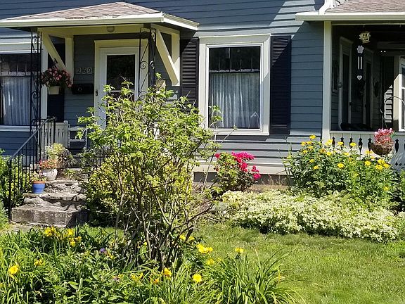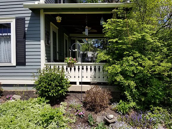 Stylish, charming, historic 3 BR, 1.5 bath home. Enjoy the character of gorgeous woodwork, hardwood floors, gas insert fireplace, formal dining room, newer kitchen with granite countertops, and first floor laundry. Many new windows. Garage. Fenced in back yard, boasting beautiful perrennial gardens. Lovely covered side porch and slate patio to add to your living space. All appliances stay. Unusual space between neighboring homes. $169,900.