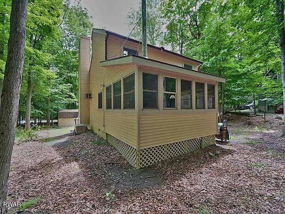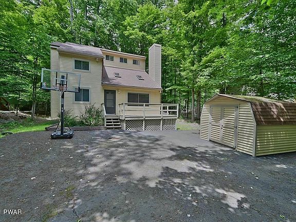 Looking for Privacy? Beautiful vinyl sided contemporary home with 28+ acre greenbelt in the rear. Located in a four season amenity filled community in The Northern Poconos just two hours from the NYC and Philadelphia Areas. Great location near golf course, indoor recreational center, fitness center and clubhouse/pub. This home is easy access with a paved driveway and just a few steps to get in, an open floor plan, new vinyl plank floors, bedroom and laundry on the main level. Living room with high knotty pine ceilings, brick fireplace with propane logs, and loft above. Sunroom with free standing woodstove and access to to the private, wooded back yard. Storage shed. There's also lakes, beaches, pools, tennis, ball fields, a ski hill, tiki bar, art center, wood workers club and more.