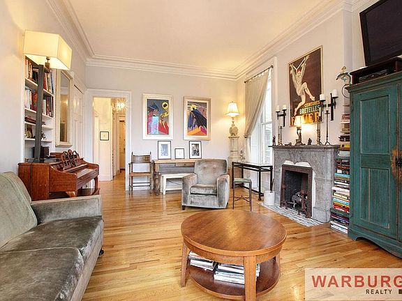 Beautiful Civil War era 1885 limestone mansion, two bedroom floor-thru. 10 oversized windows flood the apt with light from three exposures and have the original fold way shutters and casings . Windowed galley kitchen welcomes cooking and entertaining and has modern appliances.Original detail remains in the rest of the apartment including crown molding and two tiled-Carrera marble decorative fireplaces.There is a plumbing riser in the east wing of the apartment making an additional bathroom a possibility.Preserved beautifully throughout the common spaces are Minton tiles in the entry foyer, and mahogany details. Grand front yard and entrance with common sizeable back yard for all owners and is equipped with a BBQ and patio tables. In addition there is a storage ,bike and laundry room.Situated along the same block as the Pratt family mansions. A few blocks away from the subway, Fort Greene Park and many fine stores and eateries