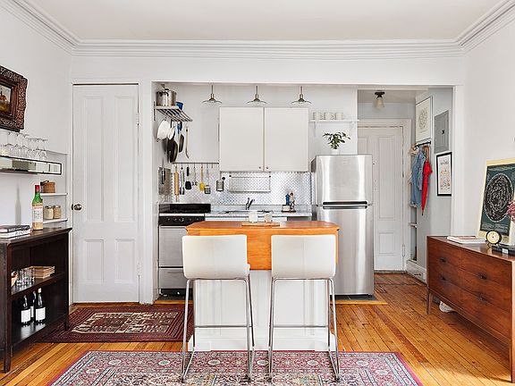 As seen in the New York Times! This serene, bright studio sits on the top floor of a perfectly preserved 1870's limestone mansion. Located on historic Clinton Ave between Dekalb and Willoughby, it is convenient to shops and restaurants on Myrtle Ave. Thoughtful touches like a reading nook, kitchen island with built-in storage, and custom-made murphy bed maximize the functionality of the cozy space, which features hardwood floors and crown moldings. With two apartments per floor and no shared walls, the self-managed co-op feels instantly like a home and community. Windows face North, South, and East, and overlook the large shared backyard. The subway tiled bathroom boasts high, vaulted ceilings and an antique skylight. Despite the low monthlies, there is designated, secure storage space for the unit as well as laundry facilities. Proximity to the C and G trains make this an ideal home whether you commute to Manhattan or stay in Brooklyn.