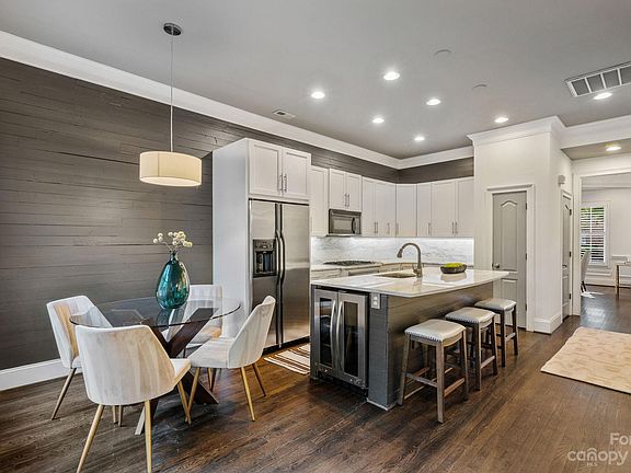 Incredible location across from the Mint Museum + in the heart of Elizabeth! All brick w/ high ceilings, expansive windows, beautiful moldings and our favorite part - the private back courtyard! Outdoor living space has a brick walled garden with lush greenery beyond. It is hard to find this kind of outdoor space and we love having no neighbors behind. Kitchen and primary bath both feature marble counters & backsplash. The appliances are SS and include a gas cooktop and wine fridge in the island. Dining Room has beautiful moldings and trim and can be used as an office/study since there is also a breakfast room. Upstairs offers three bedrooms all with great closet space. Primary w/his & hers vanities, soaking tub, sep shower with semi-frameless glass enclosure, and private water closet. Community has access to additional parking for guests through a private gate. Low maintenance community w/ water & sewer included in the HOA. Sealed crawl space and updated systems. Beautiful property!