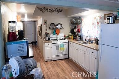 Charming Cottage in the heart of historic downtown Lake Elsinore. This two bedroom, one bath home was renovated less than five years ago including a new kitchen, roof, and flooring. The property sits on a large lot that has vehicle access on the left side of the home, allowing for vehicles to be parked behind locked gates. Security door and motion sensor lighting around property. Amenities include: Window AC units, Swamp Cooler, Enclosed Laundry, Large Fenced Yard, Water Softener, Porch, Wood Flooring. The spacious backyard has bistro string lights, fire pit, gazebo, and covered patio increasing the living space by creating such a cozy outdoor setting. Storage abounds as there is a large basement, as well as a shed in the backyard. Home is located on a no exit road minimizing street noise and maximizing privacy. Great location with convenient access to freeways, restaurants, shopping, and the lake.