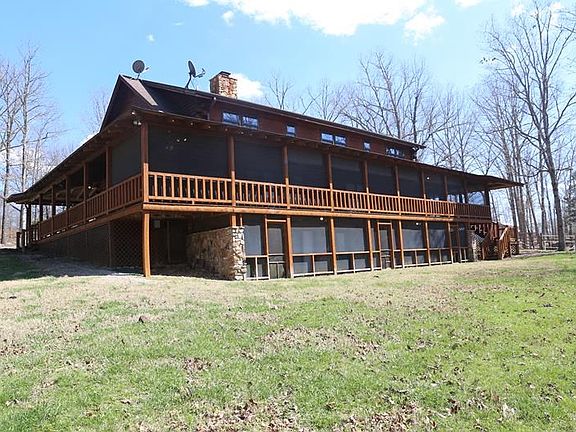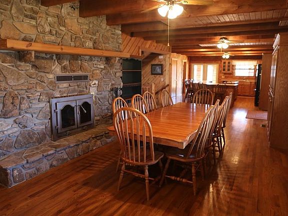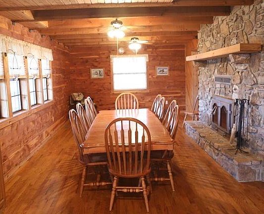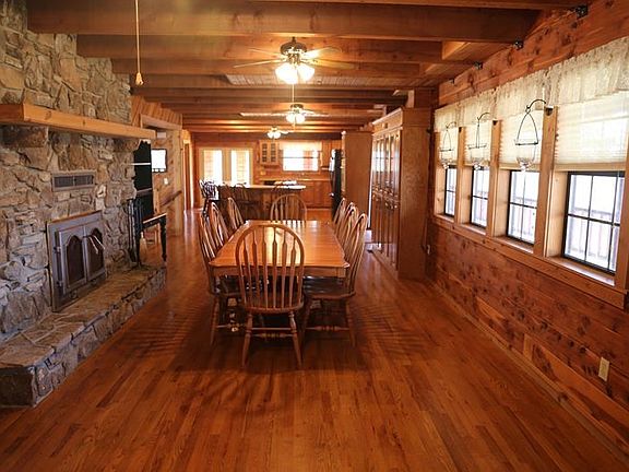 Missouri Ozarks red cedar log home on 200 acres for sale in Ozark County of southern Missouri.  This property joins the Mark Twain National Forest - Devils Backbone Wilderness in Missouri.  The Devils Backbone Wilderness takes its name from the long narrow ridge known to early settlers as Devils Backbone.  The area is characterized by miles and miles of maintained trails, springs, and the North Fork River.  It's an ideal area for day hiking, horseback riding, and backpacking.  The White River is a world class rainbow and brown trout stream.  The White River's North Fork flows through the National Forest and into the Norfork Lake.  These provide good bass, trout, and walleye fishing as well as deer and turkey hunting, hiking, canoeing, and horseback trail riding.   This log home boasts 7 bedrooms, 6 ½ bathrooms, great room, country kitchen, dining room, and guest rooms. The home has a wrap around porch that is screened on the back portion, covered porch, and sun room. The home offers pine wood flooring, a two sided native stone floor to ceiling fireplace, open beam ceiling, wood beams, pine ceilings, oak cabinets, butler's pantry, study/den, and 3 living areas.  Additional features include a 40x60 barn, RV storage garage and workshop, 4 car detached garage.