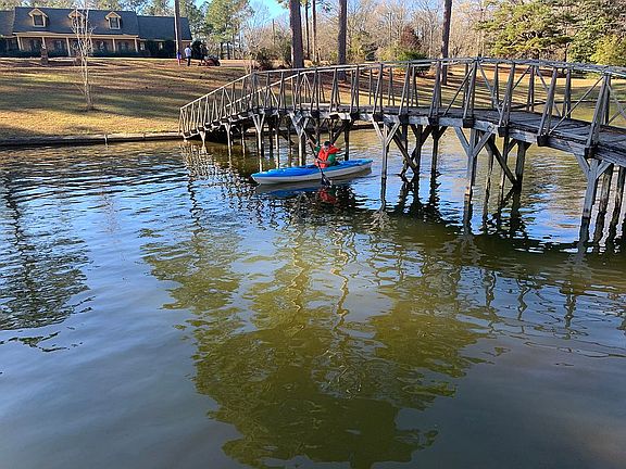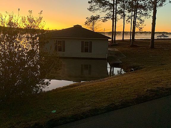Lake front with a double bay not house. Old Chicago brick, private cove on a community lake. Attached large two car garage. Detached four bay garage with an upstairs. Outdoor pavilion with fireplace, gas connection electric and water with a sink and wonderful lake view. Horse stables and fenced pasture. Numerous mature pines and hardwoods. Septic. Piano room, library, three bedroom suites downstairs, green house and garden area