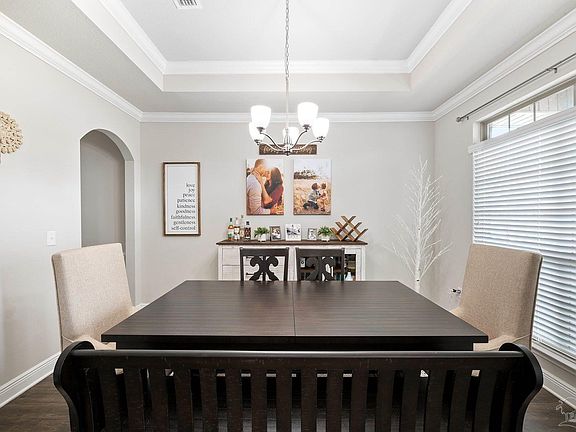 Welcome to 2690 Tulip Hill Road, located in Ashley Plantation in Pace. This 3,121 square foot home features 5 bedrooms, 3 baths, a study/flex room, formal dining room, and open floor plan. Upon entering the foyer, you'll quickly notice the 9' ceilings, and wood plank tile throughout. You'll find the study immediately to your left, and it sits adjacent to the formal dining room. As you continue on down the foyer, you'll pass by bedrooms 2 & 3 and a full bath on the left, and into the large family room. Family room offers a double trey in the ceiling, crown molding, and is complete with a wood burning fireplace. Behind the family room is a huge kitchen that contains ample cabinet and countertop space, separate island, granite tops, SS appliances, large walk-in pantry, and is perfect for entertaining. Behind the pantry is the laundry room in the center of the home. Opposite of the kitchen is the breakfast nook, and this entire area overlooks the rear covered porch. The Master suite is large and spacious, with a trey ceiling, double crown molding, a beautiful master bath with double vanities, soaking tub and separate tile shower, water closet, and large walk-in closet. On the opposite of the home are bedrooms 4 & 5, and another full bath. The backyard provides an oasis, and offers a large covered patio with place for an outdoor tv, large inground vinyl pool, covered space for grilling, plenty of pool deck and entertainment space with the pavers around a firepit and a separate spa. This home offers so many options for families to entertain with the 5 beds, 3 baths, separate office and formal dining room large kitchen and outdoor space. This home sits on .50 acres with a full irrigation system for the yard and is located is the desirable Ashley Plantation Neighborhood. Neighborhood is located in Pace, FL, and offers sidewalks, large lots, a playground and a clubhouse.