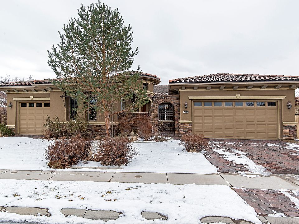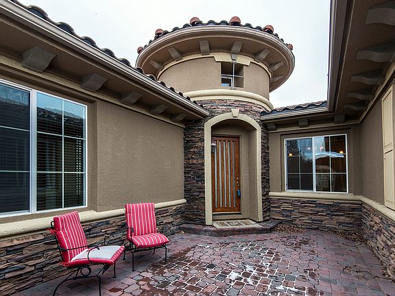 This is a beautiful single level Toll Brothers home in the exclusive gated community of Damonte Ridge in Damonte Ranch. This corner lot house has views of the mountains to the east. Enjoy the grand scale of which this Tuscan style house is built upon. The gated court yard and a high vaulted foyer great you upon entry into this grand house. The open great room will entertain all. The kitchen has a large island with seating, double ovens and a large pantry. The breakfast nook is perfect for enjoying the sun in the morning looking out over the fully landscaped back yard. No grand house would be complete without a formal dining and living room and a wet bar. The 3 bedrooms are spread out giving privacy from each other. The master bedroom is huge and is perfect retreat after a long day featuring a large shower stall and soaking tub, dual vanities and a massive walk in closet.