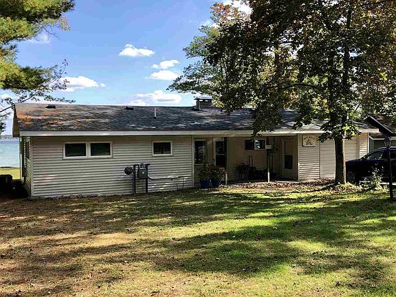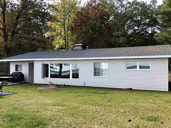 HIGGINS LAKEFRONT - 96 feet of frontage and the lot is 777 feet deep! Many recent updates including natural gas, new furnace and central air. Beautiful sandy beach with fire ring. Bunk house has been modernized. 30' x 56' pole building with large doors at both ends, concrete floors and electric. Lower west shore location with excellent depth for boat mooring. Gorgeous sunrise views and calm water! Priced to sell!