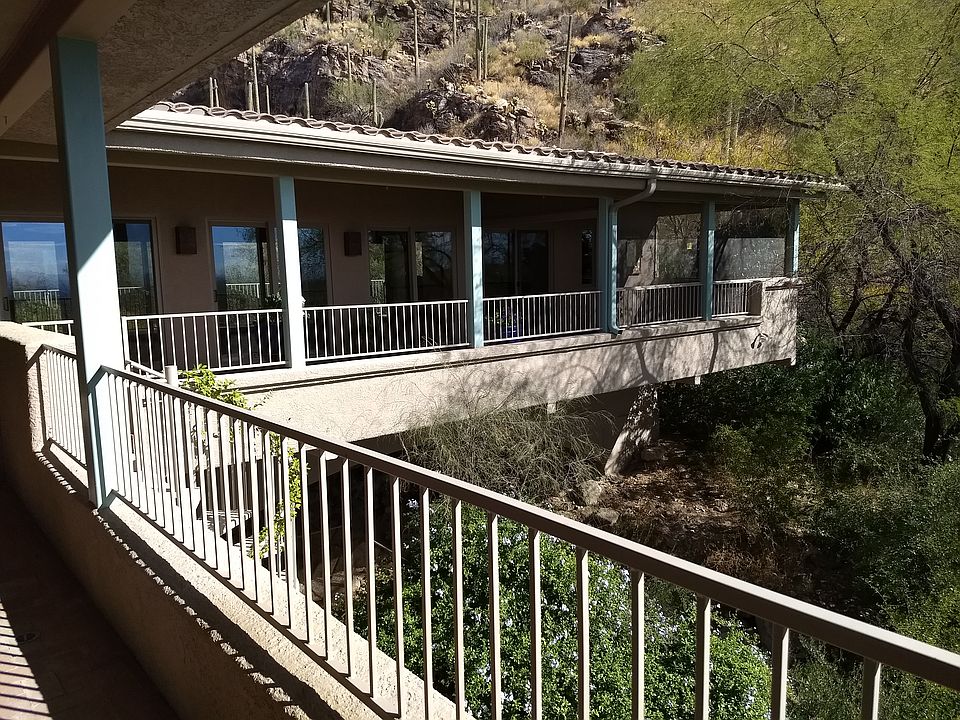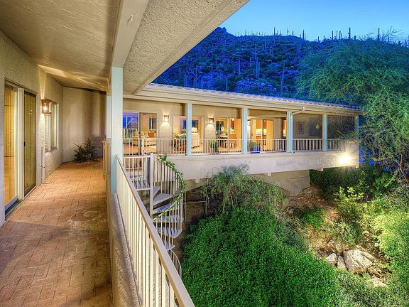 High behind the gates of Sin Vacas you find this home literally nestled in the heart of the Catalinas sitting on 21.56 acres as its backdrop. Make your way to a private driveway lined with mature natural vegetation of high country desert. Upon entering you may visit a private master suite on the first floor, just ideal for visiting guests. Then, depending on your preference, take the brick lined stair well or the elevator to the second floor where you will find a second bedroom & another master bedroom w/fireplace & spectacular mountain & city views. On this second floor we find the living room & dining room in a great room setting spanning & hydrologist inspired steel bridge over the canyon wash. Come visit & commune with nature at every turn. Borders Pusch Ridge wilderness area.