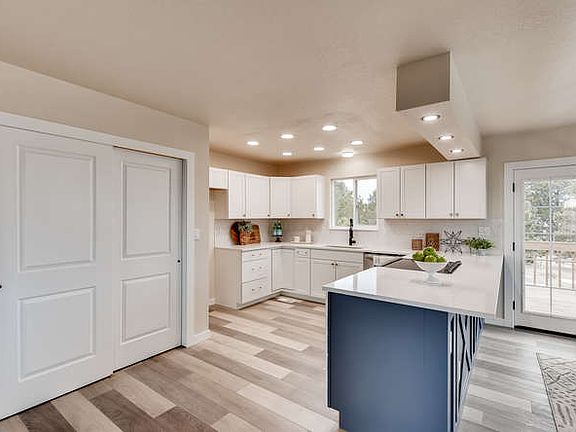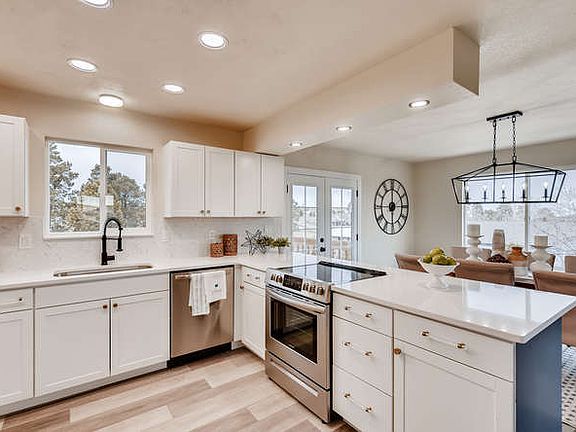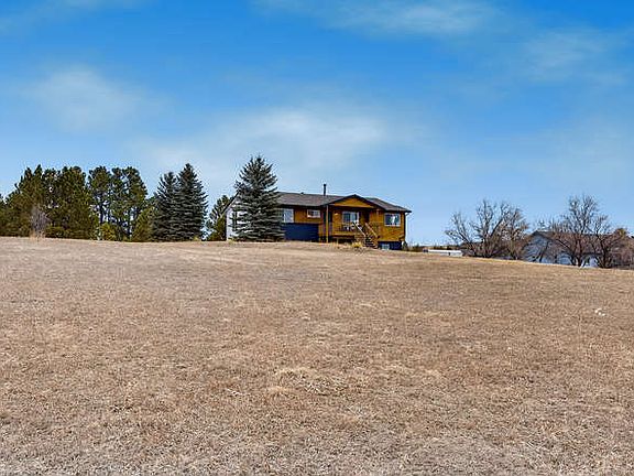 This Western Country Ranch home is Pottery Barn Perfect with designer picked finishes! Situated on almost 2.5 beautifully treed acres just a ½ mile off paved County Road 13 and 5 minutes from schools and shopping! This home boasts a new roof, gutters, septic tank, radon mitigation system, garage doors, windows, french doors, professional interior and exterior paint, remodeled bathrooms, baseboards, high end flooring, doors, hardware, lighting and a complete new gorgeous kitchen! The kitchen-great room open concept is an entertainer's delight and allows for taking in the soaring views and enjoying the wood burning fireplace while cooking or just hanging out. The master retreat has a gorgeous accent wall, barn doors, access to a huge back deck, a large walk in closet and gorgeous bathroom with room for a vanity. Your toughest decision is going to be whether you want to have your coffee on the covered front porch or on the back deck overlooking your towering Ponderosa Pines! The basement has been framed for a spacious 3rd bedroom, 3rd bathroom and nicely sized family room. This property can be fenced for horses and has access to the bridle path that connects to miles of trails! It's also just a short ride to Haven Farms, which offers horse boarding and/or drop in use of the indoor arena! Private well and septic and low Elbert County taxes are the icing!