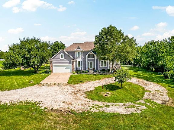 The lower level features a family room with a bar area, built-ins, and surround sound. A bonus workshop in the unfinished area includes built-in shelves, a wrap-around counter, and tile flooring. There's also a non-conforming fifth bedroom downstairs with a double closet and tile floor. Step outside to your private oasis, complete with an expanded deck, a new in 2023 above ground 52" deep pool, a beautifully fenced yard, and expansive fields. 12'x20' shed with skylights and windows gives you extra storage. Located in the Lee's Summit school district, which includes the new East Trails Middle School, this property offers easy access to highways. This amazing country living opportunity is what you have dreamed of—enjoy the tranquility of rural life while being just minutes away from city conveniences!