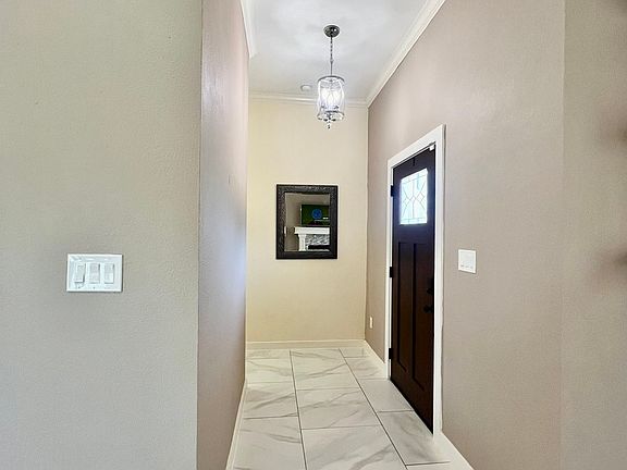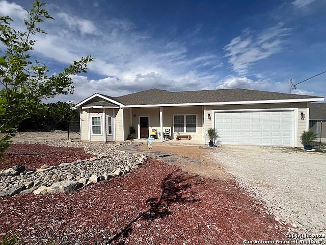 Nestled in the Lake Hills Estate with a voluntary HOA, this energy-efficient residence, boasting a two-car garage and a beautiful wood door. As you step inside, you'll be greeted by an open floor plan, high ceilings, and a sleek porcelain flooring, complemented by elegant crown molding throughout the living space. The electric fireplace enures cozy winter months, while the kitchen features quartz countertops, a stunning backsplash, and full-light gliding patio doors with built-in blinds leading to the covered patio. The kitchen appliances are included, and the spacious bedrooms feature a primary suite with a generous walk-in shower and rain showerhead. The home is fully fenced, perfect for families and pets, with a low-maintenance front yard and a rear gate providing additional parking. Additional features include pre-plumbing for a water softner, a doorbell camera, recessed lighting, and a picturesque Hill Country view from the back patio.Please confirm all schools, measurements and sq ft. Thank you for your interest.
