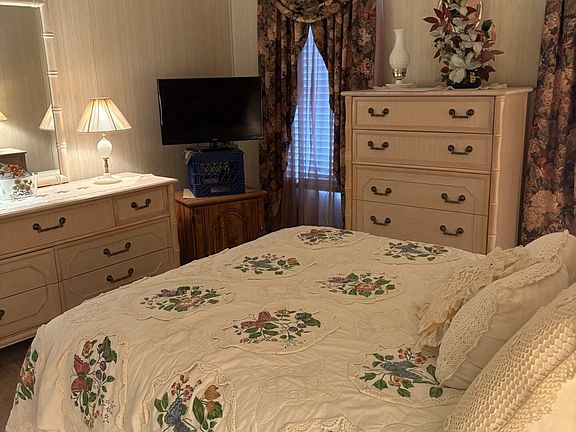 This home comes fully furnished, allowing you to move in with ease. Ideally located within walking distance to the community pool and hot tub, the residence features two bedrooms and two bathrooms, including a spacious primary suite with a walk-in closet. The kitchen is equipped with a refrigerator, range, microwave, dishwasher and garbage disposal. The adjoining dining room includes a built-in China cabinet for added storage. Laminated flooring enhances the kitchen and dining areas, while the reminder of the home is carpeted for comfort. The inviting Florida room offers vinyl windows two recliners-one of which is a lift chair-and a large screen TV, making it an ideal space for relaxation. Golf Cart included.