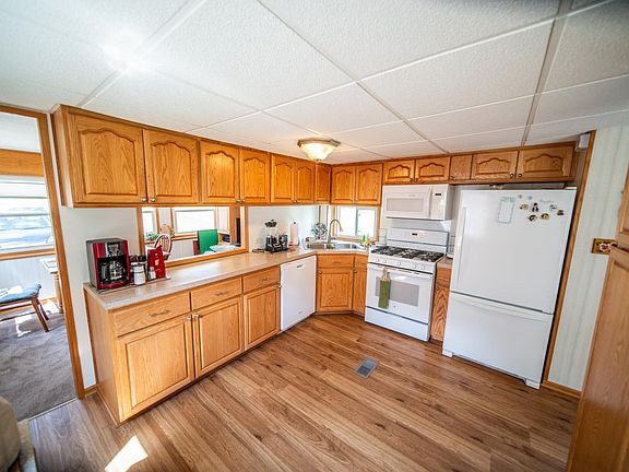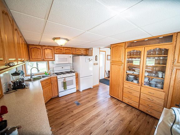 Welcome to this exceptional 3.2-acre property, a true haven of tranquility and utility. The centerpiece is a 70x24 fully insulated, heated concrete garage/shop—perfect for hobbyists or professionals needing a versatile workspace—complemented by a spacious 54x20 pole shed for all your storage needs. The beautifully remodeled 2-bedroom, 1-bathroom mobile home is a testament to quality, featuring handcrafted oak custom cabinets and a matching oak hutch, with pullout drawers for effortless organization. Solid oak doors and trim add an element of timeless elegance to the home.