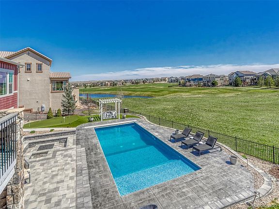 Overlooking the 8th fairway of the Blackstone Country Club Golf Course in Aurora, this incredible 2- story luxury home with walkout basement is an entertainer’s delight. An expansive fully fenced backyard with a stunning sparkling pool, covered hot tub, multi-tiered gas fire pit, large putting green with chipping area and in-ground trampoline provides the perfect setting to host team parties or family gatherings large or small. Luxury interior details include designer wall covers, tile, and on-trend lighting and stainless appliances. With 3br/2ba + loft upstairs, an exquisite master suite and bedroom/office with nearby guest bathroom on the main floor, and an additional 2 br/1ba in the basement, there’s plenty of space for guests and loved-ones alike. Entering the home from the covered front porch, a foyer opens to a dining room with tile accents and great room with living room and grand kitchen. Gas fireplace, engineered wood flooring, big view windows, granite counters with live edges, shaker style white cabinets, stainless steel appliances and double sink, walk-in pantry, and mudroom leading to a 2/1 split tandem garage creates a smart layout with stylish detail. The walkout basement has a great flow from inside to the incredible outdoor areas. A family room with fireplace, surround sound speakers, wet bar with 2 beverage coolers, exercise room, storage and 2 bedrooms with bathroom adds to this special home. Elegant country club facilities include restaurant and coffee shop, tennis and pickleball courts, exercise and pool access, and are available with a social community membership or purchase full membership for full access to both Blackstone Country Club and Black Bear Golf Club in Parker. Southland Mall, grocery and fuel are minutes away as is access to E470, DIA, multiple golf courses, Cherry Creek Schools, and Aurora Reservoir.