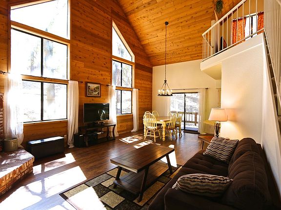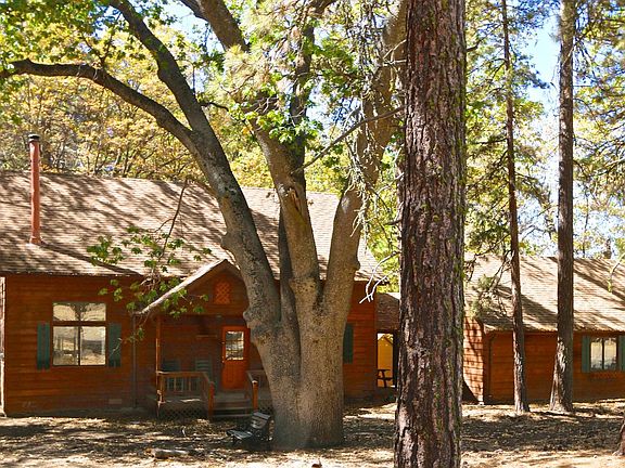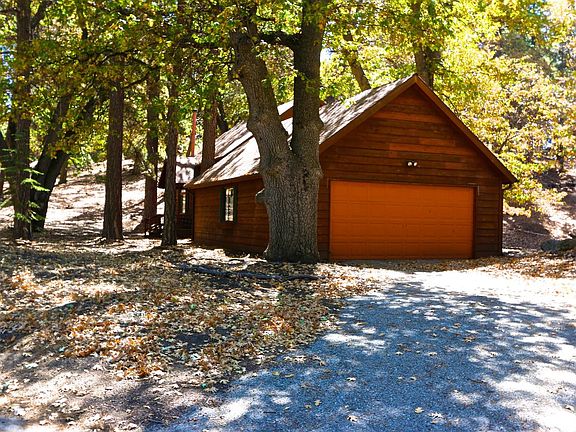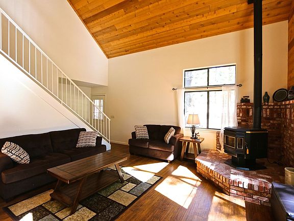Located on a quiet cul-de-sac and set in a mature forest of oaks and pines, this charming mountain home is move-in ready. Enter to soaring tongue & groove ceilings and a large open floor plan with cozy living and dining areas and a spacious kitchen with pantry. You'll find the first of two bedrooms downstairs with adjacent bath and the second upstairs with a walk-in closet, private bath and an open loft area. A full sized laundry room is located on the main level with loads of storage. This home is heated by a pellet stove and central forced air heating. Detached 3-car garage with 1/2 bath is just steps from the main home via a breezeway and behind the home you'll find a 2 stall shelter for horses with tack/hay room. This property is comprised of 2 lots which have been combined with just one Association Dues payment.