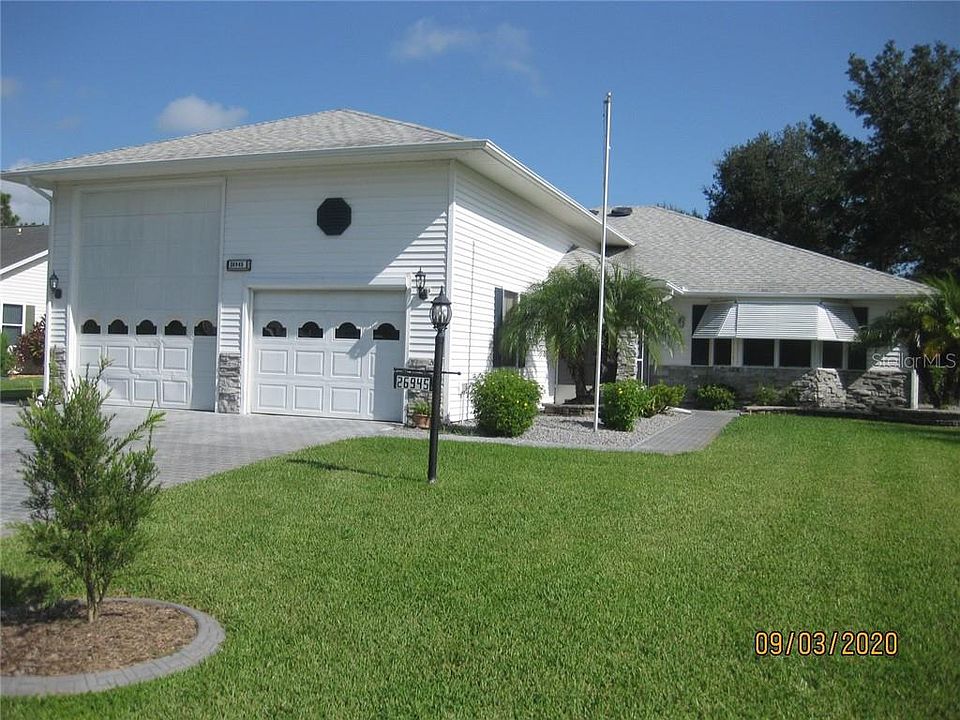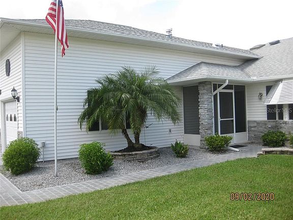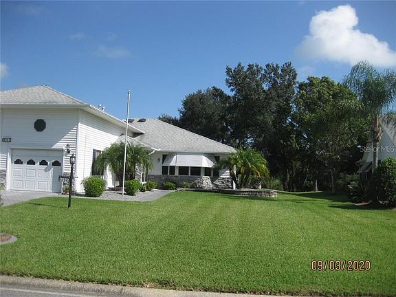 MOVE-IN READY! This 2 bedroom, 2 bathroom home is the only one of the 938 homes in Highland Lakes with a RV GARAGE. Garage is 32" deep measured with a 12" tall garage door. Bring your RV, boat, trailer, or other toys. Garage has sewer clean out, 220 volt outlet, central vacuum system, work bench and spacious storage. Home is substantially handicapable. Skylights, pocket doors, open floor plan, whole house Generac (powered by natural gas with battery backup), roof 2011, Tran HVAC 2018 with 10 year warranty, water softener, with a large 23'x17' covered screen porch overlooking the large rear conservation area. Highland Lakes is a 55+ gated community and offers inside and outside pools, clubhouse and many amenities. Dues are a mere $93 a month. Minutes from shopping and the Florida Turnpike.