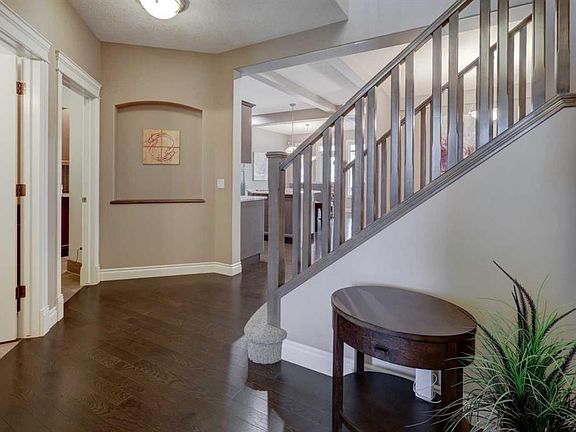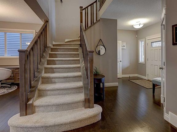 ****OPEN HOUSE SAT NOV. 22 FROM 2-4**** Welcome to your new home in Ravenswood - where luxury & fine details combine with location & pride of ownership. This home is completely move in ready & all of the upgraded features of this former MCKEE SHOWHOME showcase timeless elegance and modern comfort. As you enter the quaint front porch note all of the room you have for seasonal decorating or a cute coffee space if desired. The extremely generous FOYER leads either to the OPEN CONCEPT main floor or down to the lower level - would be very easy to wall off the entryway & create a sep entrance for a private basement living if desired. As you continue onto the main floor note the gleaming REAL HARDWOOD FLOORS - immaculately maintained & cared for - as well as the BEAMED CEILINGS - a highly upgraded feature rarely found in homes today. The 2 pc bath is tucked away next to the mudroom space. Enter the main hall and note the HOME OFFICE SPACE w/BUILT IN CABINETRY & desk. The highly upgraded kitchen boasts granite counters, BUTLER'S PANTRY, SS BOSCH APPLIANCES, touchless MOEN FAUCET (lifetime warranty) & a massive dining space. All of this leads to the very generous living room w/ gas fireplace & WEST FACING light. The majority of the windows on the west side of the home (both main and upper floors) have been upgraded to TRIPLE PANE. Head upstairs noting the classic WOOD RAILINGS & curved PLATFORMS on the stairs & enter the BONUS ROOM SPACE w/VAULTED CEILING & lots of natural light. The PRIMARY is host to a spa-like ensuite - sep corner SOAKER TUB, large tiled shower, 2 sinks & recessed water closet - all w/granite & upgraded finishings matching the rest of the house. The primary bedroom itself is adorned w/COVE CEILINGS, POT LIGHTS & built in speakers controlled from a receiver in the basement (all equipment included). These speakers are in other areas of the house as well, including the garage! Note the beautiful ambiance when you arrive for your viewing. The upper level is completed by 2 very large secondary bedrooms, fully upgraded 4 pc main bath & laundry room w/FRONT LOAD washer/dryer (included) & a nice window. The FINISHED BASEMENT adds flexible living space with a full bath and storage. The original MCKEE plans showed this basement dev w/2 more bedrooms (pls see plan in the photos as well as in the supplements). This plan could be completed by the new owners of this home making this a 5 bedroom property - perfect for a growing family or possibly as an illegal suite. Lastly, experience year-round relaxation on the covered deck w/hot tub, surrounded by low-maintenance landscaping in the back yard & zero scape in the front. Other upgrades include A/C, ON-DEMAND HOT WATER & DELTA FAUCETS. Steps to parks, schools (including Airdrie’s only FRANCOPHONE SCHOOL), green space, ponds & outdoor rink, this home combines luxury, comfort, and community. Come and see why Ravenswood is a great choice for family living.