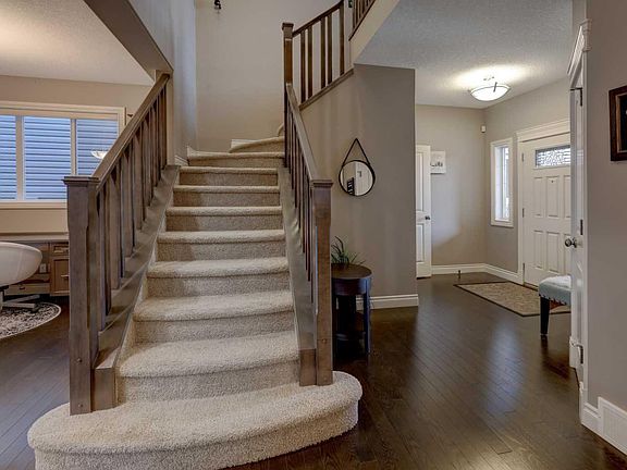 ****OPEN HOUSE SAT NOV. 22 FROM 2-4**** Welcome to your new home in Ravenswood - where luxury & fine details combine with location & pride of ownership. This home is completely move in ready & all of the upgraded features of this former MCKEE SHOWHOME showcase timeless elegance and modern comfort. As you enter the quaint front porch note all of the room you have for seasonal decorating or a cute coffee space if desired. The extremely generous FOYER leads either to the OPEN CONCEPT main floor or down to the lower level - would be very easy to wall off the entryway & create a sep entrance for a private basement living if desired. As you continue onto the main floor note the gleaming REAL HARDWOOD FLOORS - immaculately maintained & cared for - as well as the BEAMED CEILINGS - a highly upgraded feature rarely found in homes today. The 2 pc bath is tucked away next to the mudroom space. Enter the main hall and note the HOME OFFICE SPACE w/BUILT IN CABINETRY & desk. The highly upgraded kitchen boasts granite counters, BUTLER'S PANTRY, SS BOSCH APPLIANCES, touchless MOEN FAUCET (lifetime warranty) & a massive dining space. All of this leads to the very generous living room w/ gas fireplace & WEST FACING light. The majority of the windows on the west side of the home (both main and upper floors) have been upgraded to TRIPLE PANE. Head upstairs noting the classic WOOD RAILINGS & curved PLATFORMS on the stairs & enter the BONUS ROOM SPACE w/VAULTED CEILING & lots of natural light. The PRIMARY is host to a spa-like ensuite - sep corner SOAKER TUB, large tiled shower, 2 sinks & recessed water closet - all w/granite & upgraded finishings matching the rest of the house. The primary bedroom itself is adorned w/COVE CEILINGS, POT LIGHTS & built in speakers controlled from a receiver in the basement (all equipment included). These speakers are in other areas of the house as well, including the garage! Note the beautiful ambiance when you arrive for your viewing. The upper level is completed by 2 very large secondary bedrooms, fully upgraded 4 pc main bath & laundry room w/FRONT LOAD washer/dryer (included) & a nice window. The FINISHED BASEMENT adds flexible living space with a full bath and storage. The original MCKEE plans showed this basement dev w/2 more bedrooms (pls see plan in the photos as well as in the supplements). This plan could be completed by the new owners of this home making this a 5 bedroom property - perfect for a growing family or possibly as an illegal suite. Lastly, experience year-round relaxation on the covered deck w/hot tub, surrounded by low-maintenance landscaping in the back yard & zero scape in the front. Other upgrades include A/C, ON-DEMAND HOT WATER & DELTA FAUCETS. Steps to parks, schools (including Airdrie's only FRANCOPHONE SCHOOL), green space, ponds & outdoor rink, this home combines luxury, comfort, and community. Come and see why Ravenswood is a great choice for family living.