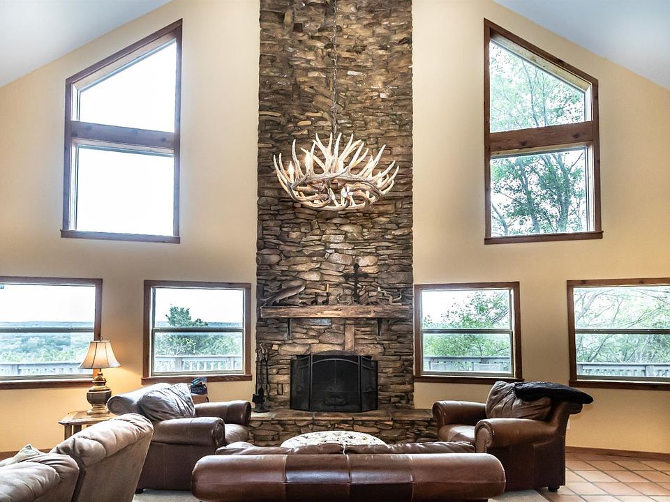 This beautiful, must see custom home is ready for lake fun, hiking, and you! It boasts spectacular mesa views from the decks and over 4 acres full of mature Live Oak, Cedar Elm, Cedar, and Mesquite trees. It is incredible to see white tail, mule deer and turkeys on your walks or as you are having your morning coffee at the spacious breakfast bar. This property has a view of the lake & Big Grape creek, and gorgeous sunsets. The magnificent stone fireplace is 23 feet high! This retreat is not just for summer fun...winter nights call for hot chocolate, movies and games snuggled up by the fire. There is custom red oak cabinetry throughout, new exterior paint, and lots of storage. Two of the bedrooms have french doors leading out to your own covered patio. There is 961 sq. of patio (Trex decking) and additional space to relax or entertain.