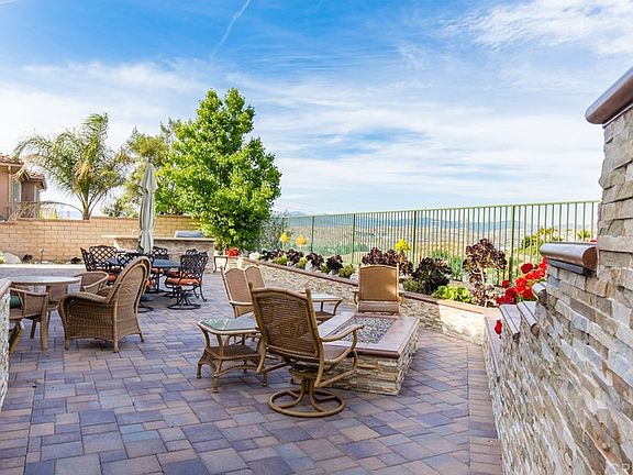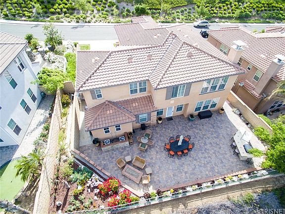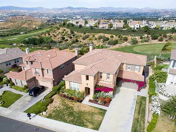 Beautiful View Home in Prestigious Westridge Valencia. Presenting a 5 bedroom, 5 totally upgraded bathroom home with a panoramic view of the mountains, valley, city lights, and the 7th fairway of TPC-Valencia golf course! Quiet cul-de-sac street with private yard. Short walking distance to the award-winning Westridge schools. As you tour the home your eyes will be drawn to the solid wood plantation shutters, 8 1/2 inch crown molding, and solid wood flooring throughout. After passing the formal living and dining rooms, you will see the new, custom-made staircase with wrought iron balusters. Entering the kitchen you'll find a large island/breakfast bar with granite counters, stainless steel appliances, work space, and area for a meal table. The kitchen opens up to the family room, with an entertainment niche and fireplace. There's another work area just off the kitchen. Also on the main level is a guest bedroom with en suite full bath, and a powder room with an Italian vessel sink and Mascarello Leather granite counter. Upstairs you'll find built-in book cases, three more guest bedrooms, two full bathrooms, and the master suite, which has a retreat, separate tub and shower, and dual vanities. The entertainer's backyard was professionally built with Angelus